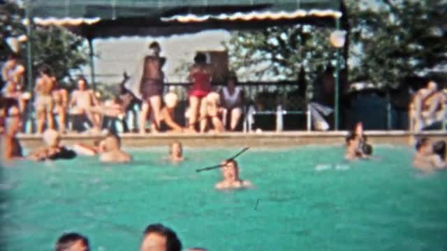 389181 - 1959: People of all ages playing in public pool during a hot summer day.