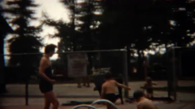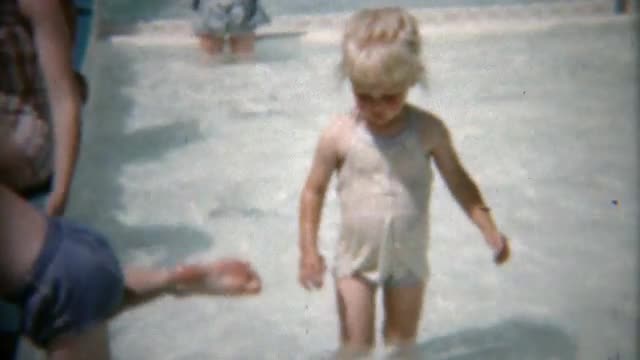 422847 - 1957: Little girl playing in a shallow public pool under mom's supervision.
