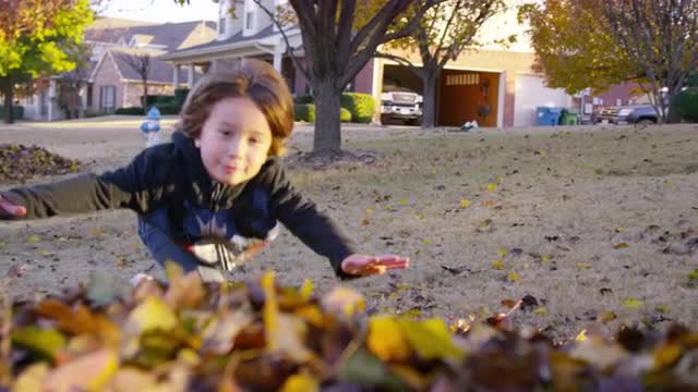 1010513 - Boy excitedly runs towards a pile of leaves and falls short when jumping in