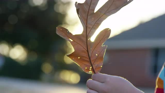 1010600 - A large leaf reveals the setting sun while a boy examines it in his hands