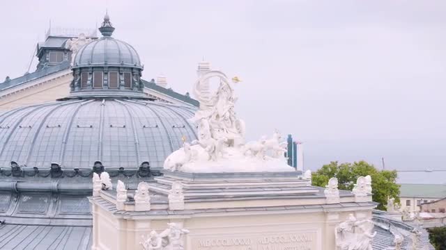 1094246 - Aerial pull back and wrap around statue on Odessa National Theater 4K