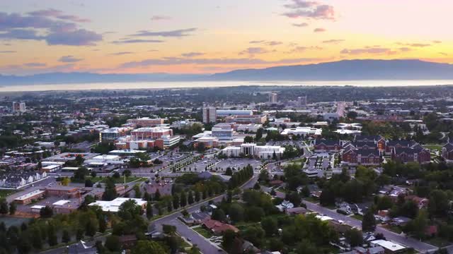 1096447 - Aerial speed ramp view of BYU campus at dusk 4K