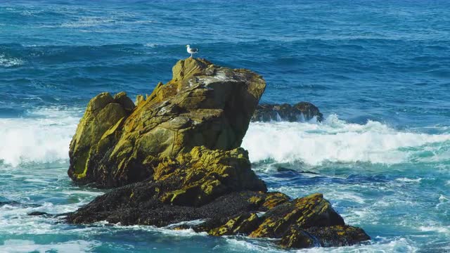 1096459 - Seagull leaps higher on rock amidst crashing ocean waves on beautiful day