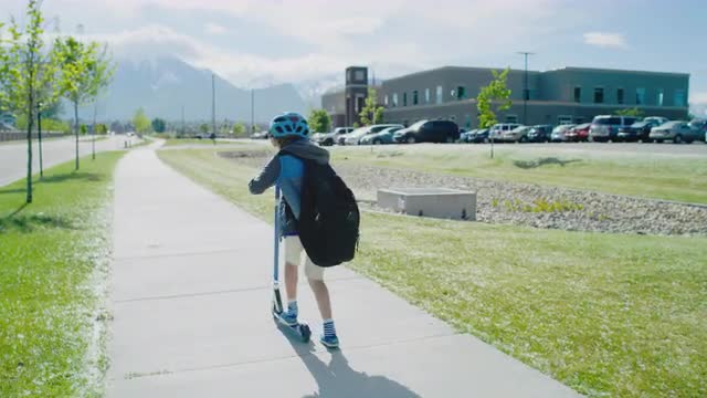 1100503 - Young boy rides scooter towards school in late morning while wearing helmet
