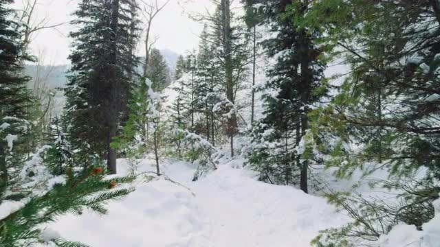 1105327 - Walking point of view in winter landscape with snow covered evergreen trees