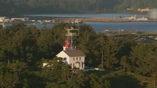 Newport, Oregon circa-2017, Aerial shot of Yaquina Bay Lighthouse. Shot with Cineflex and RED Epic-W Helium.