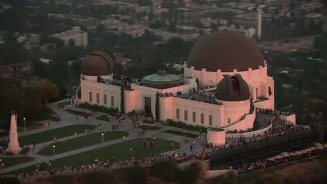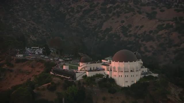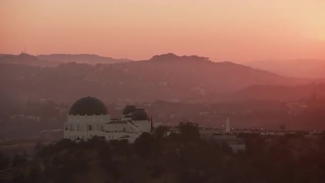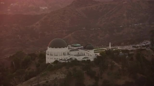 Los Angeles, California circa-2017, Aerial shot of Griffith Observatory and Hollywood sign at sunset. Shot with Cineflex and RED Epic-W Helium.