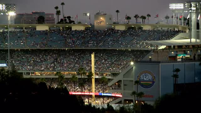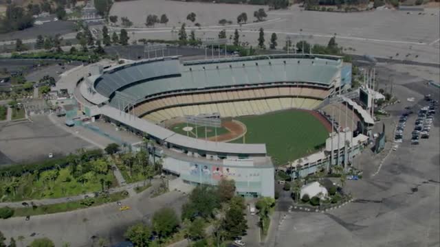 Los Angeles, California circa-2017, Flying by Dodger Stadium with downtown Los Angeles in distance. Shot with Cineflex and RED Epic-W Helium.