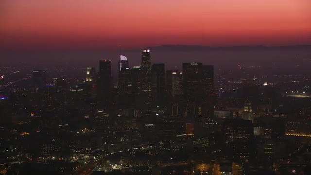 Los Angeles, California circa-2017, Aerial shot of Los Angeles at dusk with colorful sunset. Shot with Cineflex and RED Epic-W Helium.