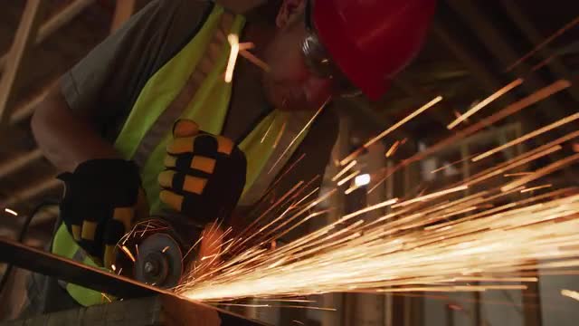 1000536 - Construction worker grinding metal, closeup, slow motion