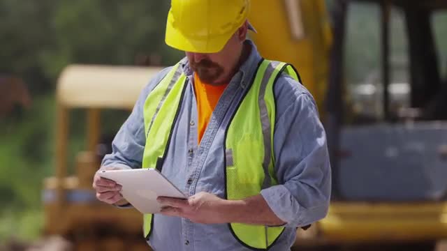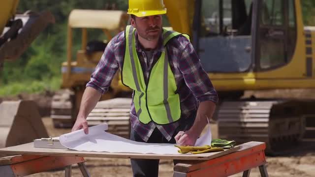 > Focus on items in foreground with construction worker in background
