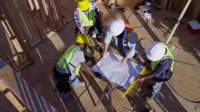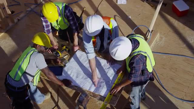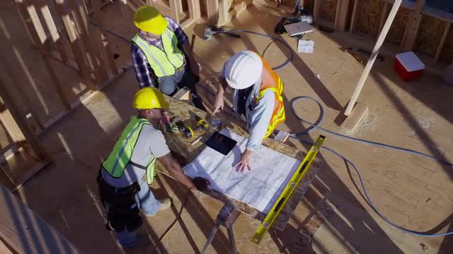> Three construction workers looking over blueprints, overhead shot