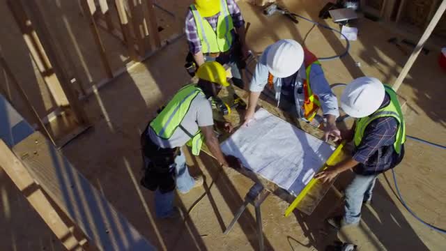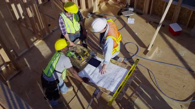 > Three construction workers shaking hands over blueprints, overhead shot