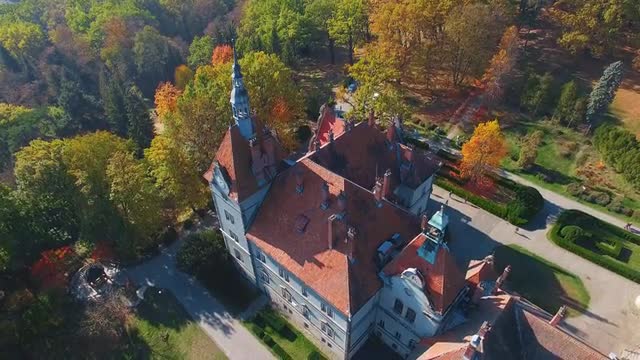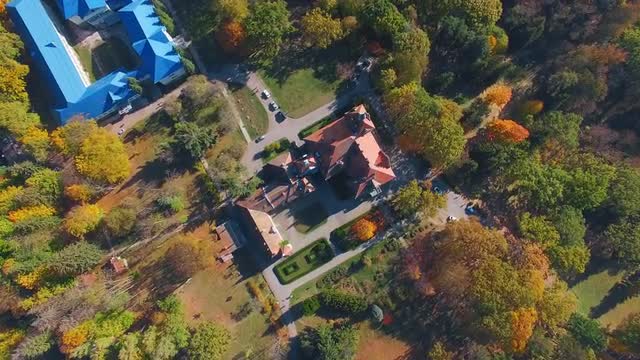 Portland, Oregon circa-2017, Aerial shot of Pittock Mansion in Fall. Shot with Cineflex and RED Epi