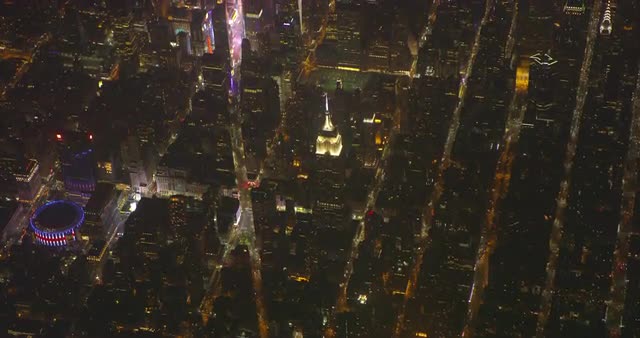 Aerials of Madison Square Garden. 80s New York City. Empire State Building. Exterior of Madison Square Garden at night.