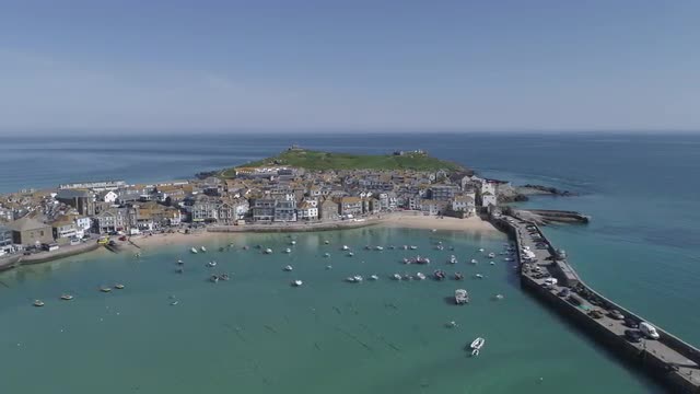 4K Aerial footage of St Ives harbour on a beautiful sunny day in June 2018. Cornwall, England, United Kingdom