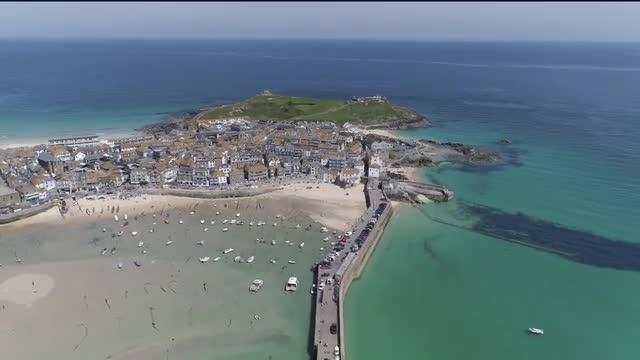 > 4K Aerial footage of St Ives harbour on a beautiful sunny day in June 2018