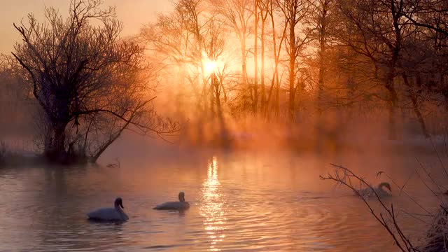 > Swan herd in a pond, Hokkaido, Japan