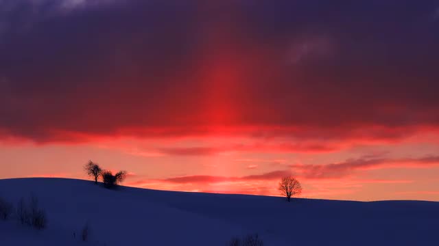 Beautiful sunset sky over snow field, Hokkaido, Japan