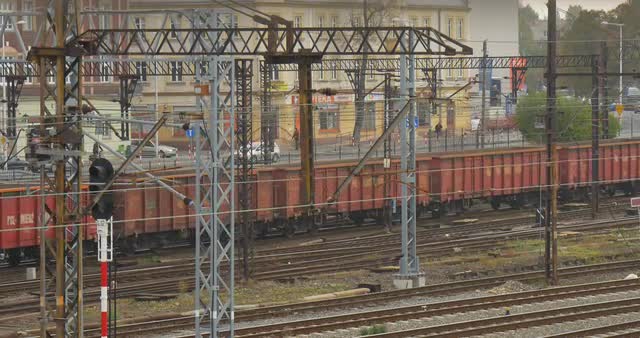 Highway with motor vehicles and a railway with an electric train in the countryside. Aerial view transport infrastructure with highway and railway.