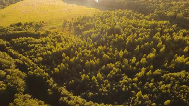 Aerial view green forest, treetops, forest area. Pine, spruce forest from above. Flight over mixed forest on a sunny summer day