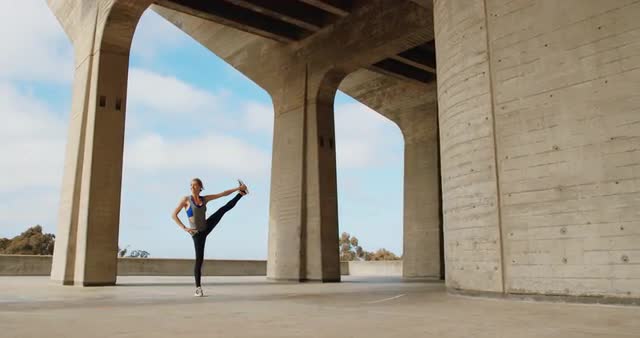 Young fit woman exercising outside stretching in modern urban environment outside on sunny day