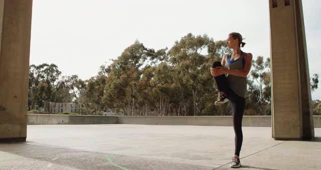 Young fit woman exercising outside stretching in modern urban environment outside on sunny day