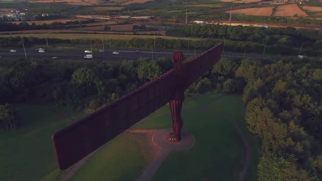 > Close up Drone footage of the Angel of the North at sunrise, Gateshead