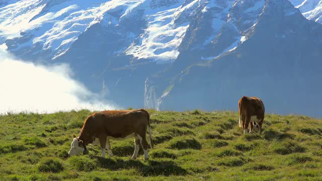 A brown cow stands on the street in the swiss alps and looks into the camera.