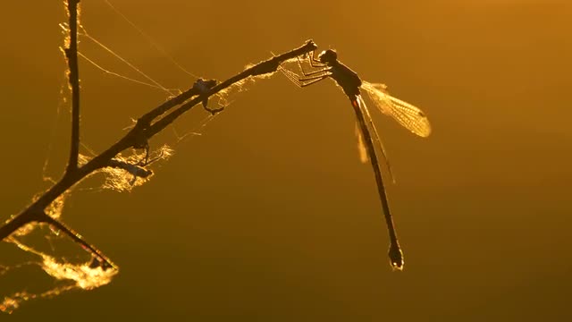Willow emerald damselfly (Chalcolestes viridis) at sunset