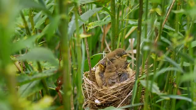 > Marsh warbler (Acrocephalus palustris) feeding chicks in nest