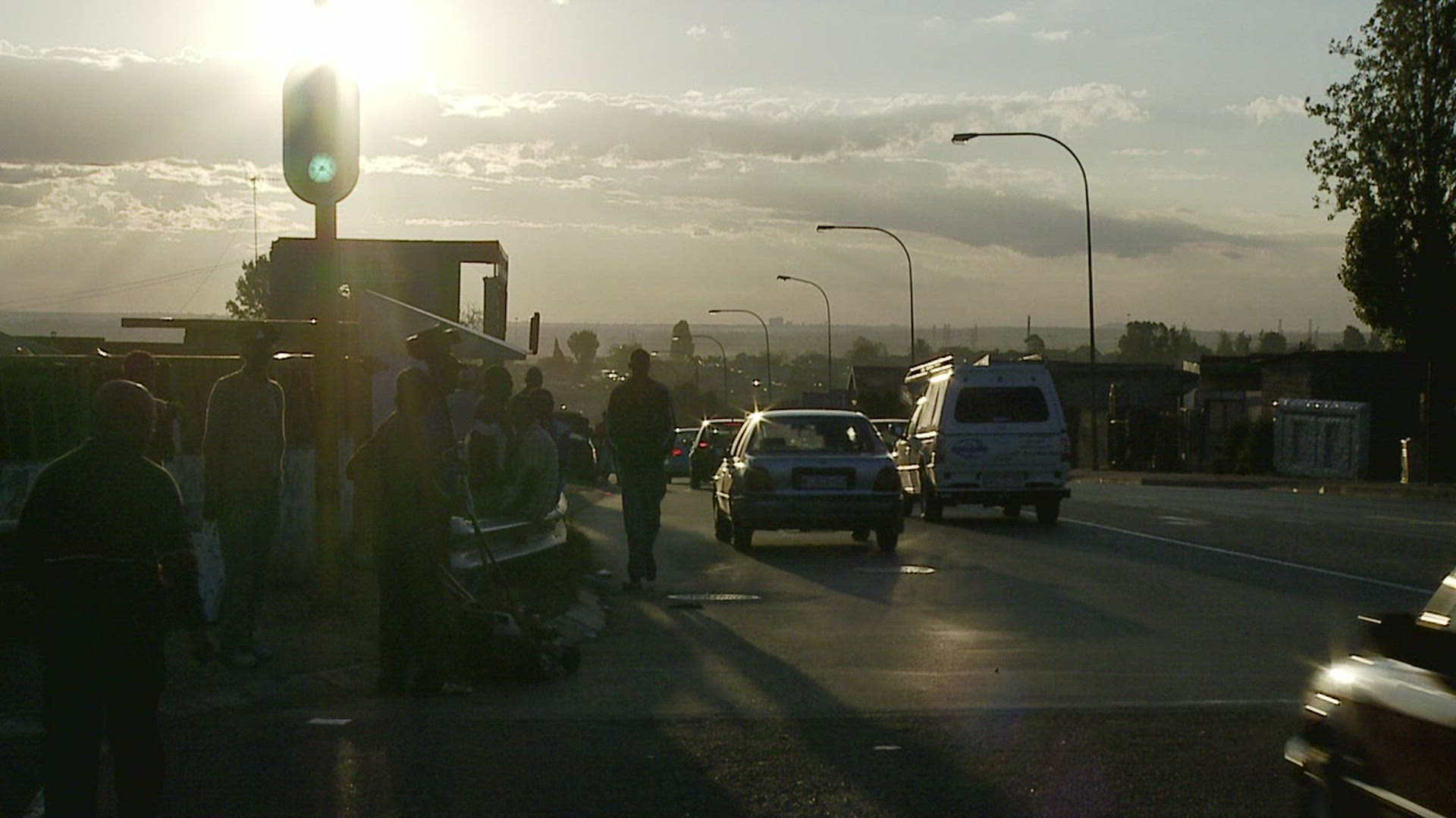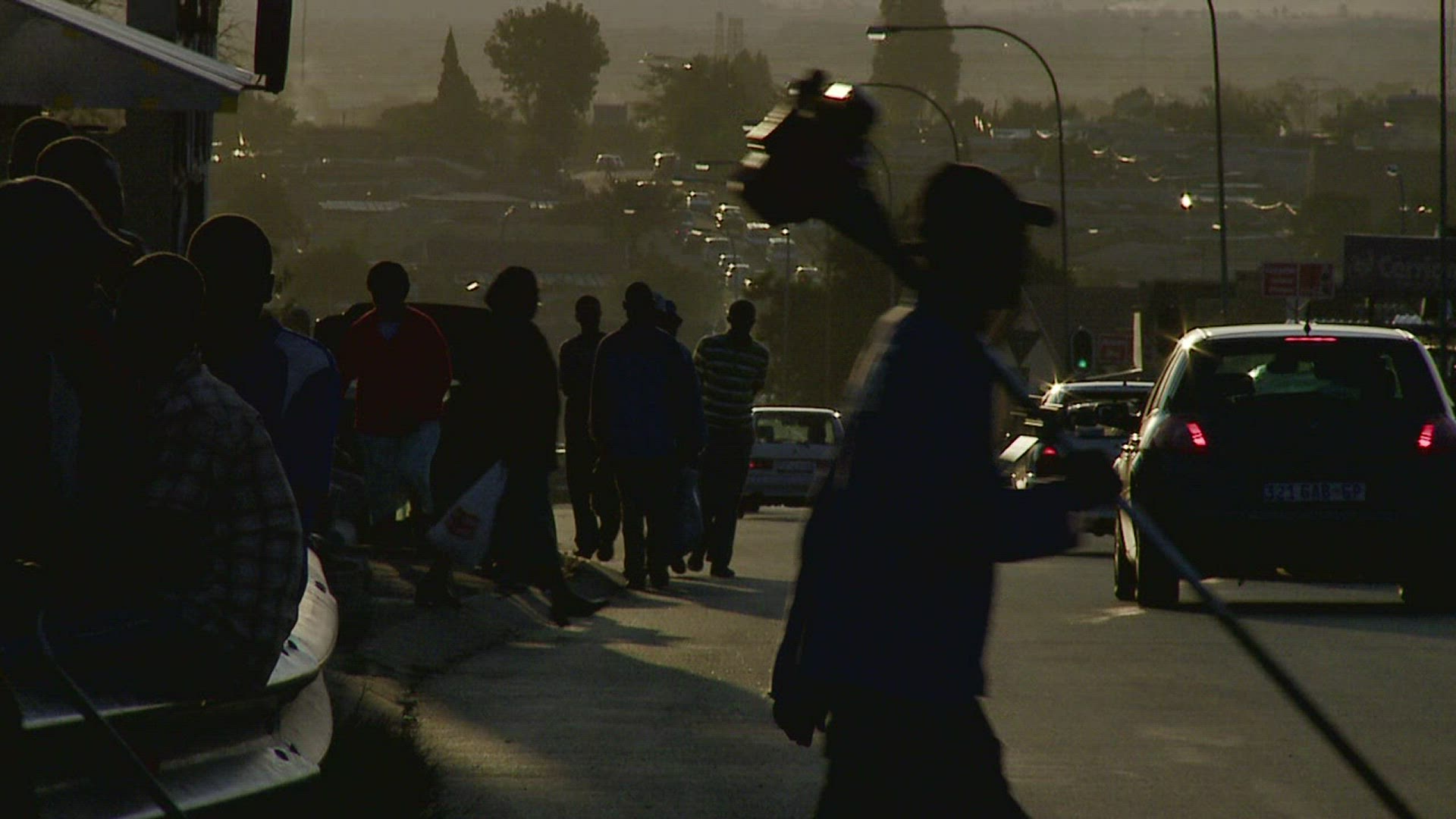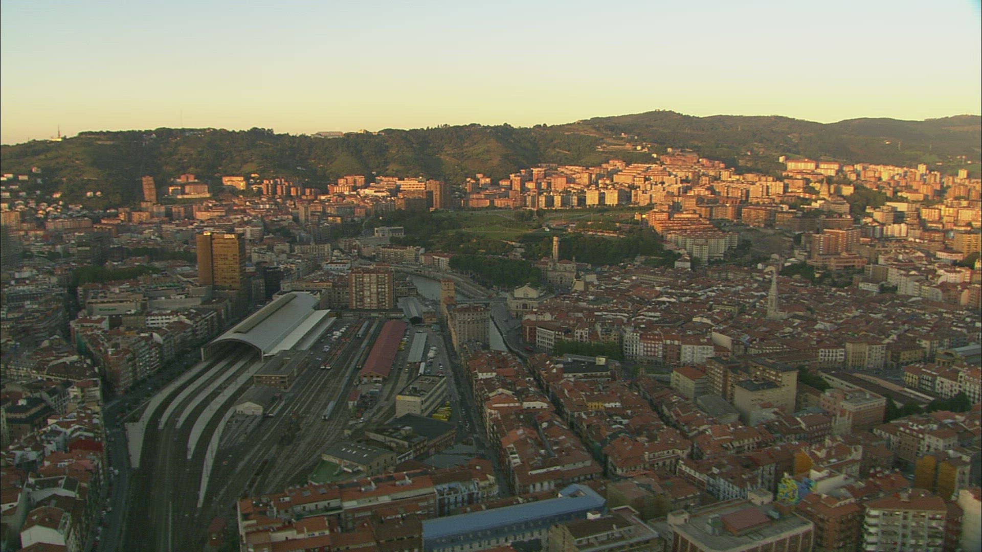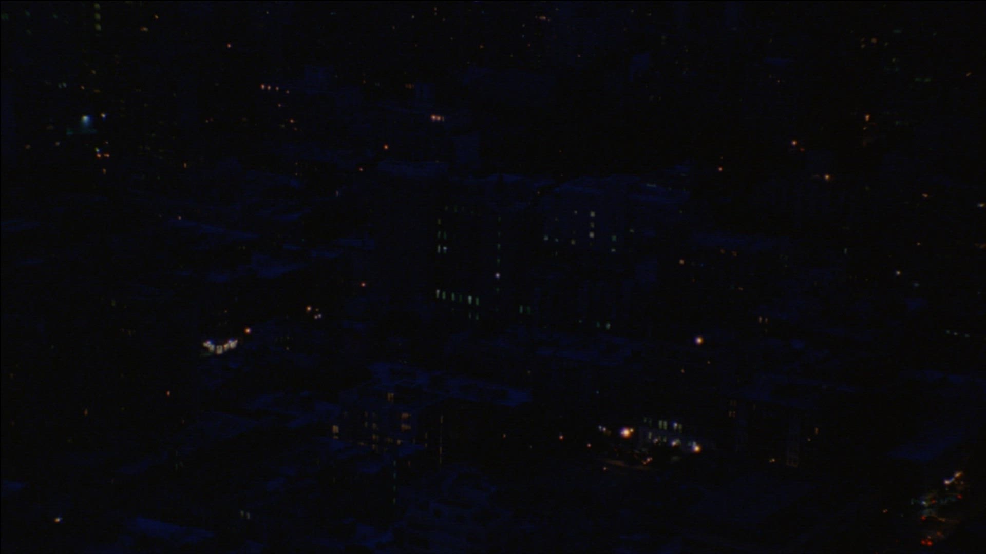 Large shadows eclipse the skyline as the sun sets over downtown Los Angeles, California.
