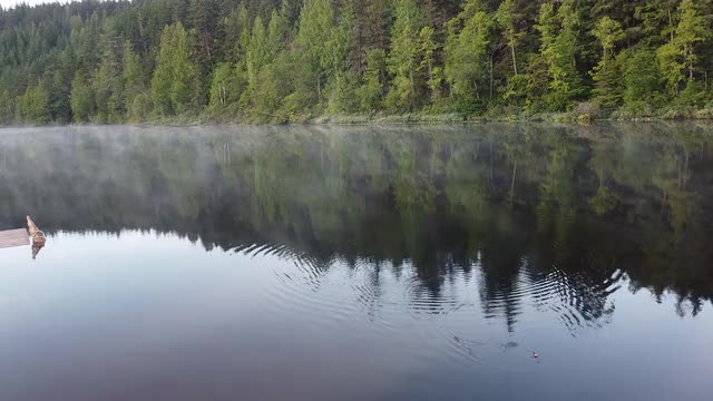 1129109 - View over crystal clear water on the lake with moving fog and fisherman's bobber