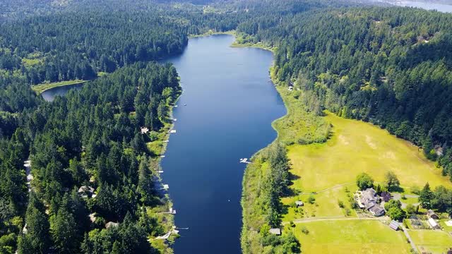 1129632 - Fly over the mirror lake, reflecting the blue clear sky. Small houses hiding in the spruce green for