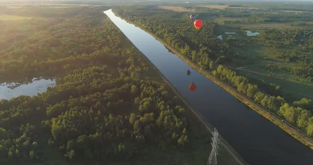 Aerial view Hot air balloons in sky over river in countryside, beautiful sky and sunset. Aerostat fly over countryside. Aerial footage 4K