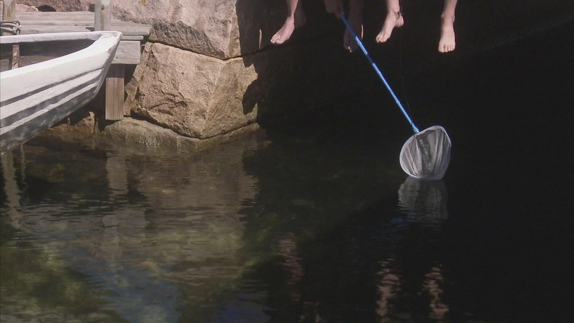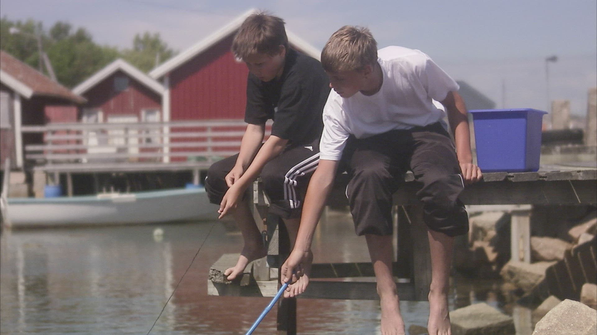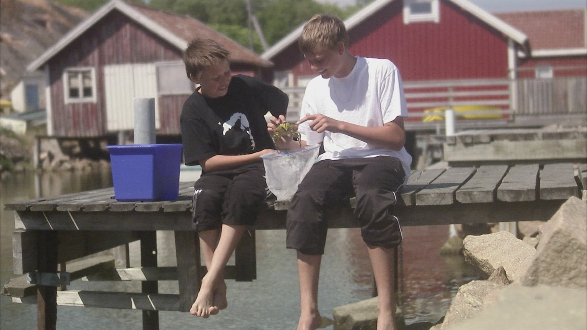 two boys on jetty fishing crabs in Bohuslän