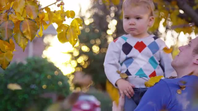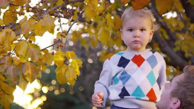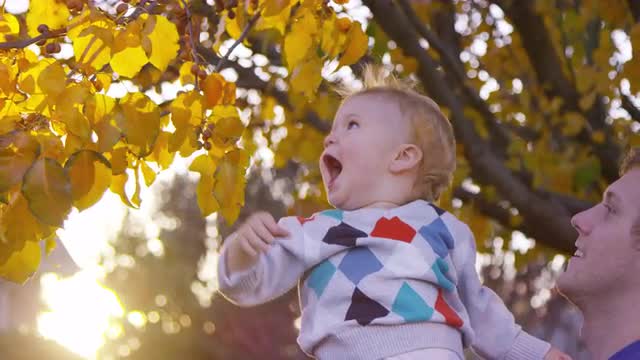 > Father lifts up toddler boy so he can look at tree leaves during autumn sunset