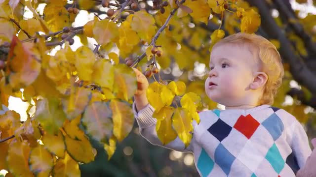 Father lifts up toddler boy so he can look at tree leaves during autumn sunset