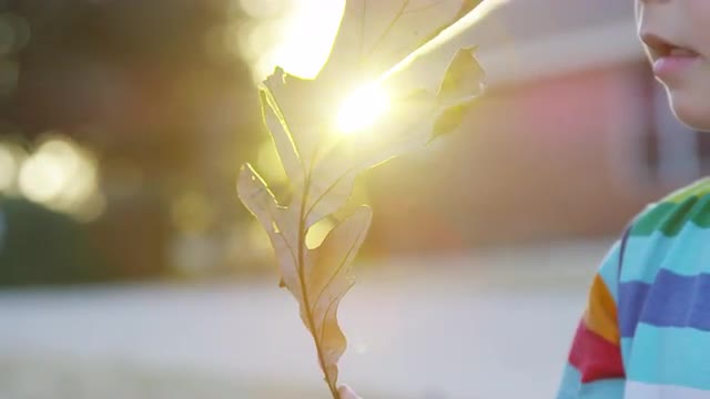 Close on a leaf beind held by a young boy during sunset with a sun flare