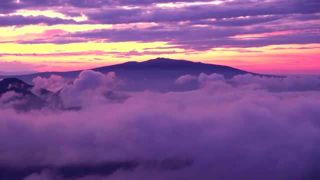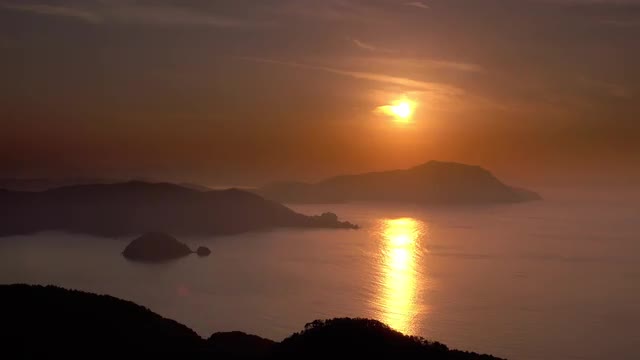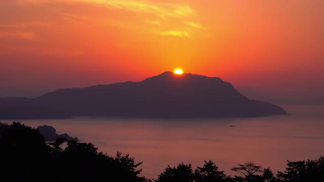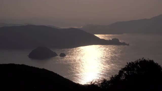 Sun rises over the waves and hills of Ipanema beach in Rio de Janeiro, Brazil. A palm tree foregrounds the shot.