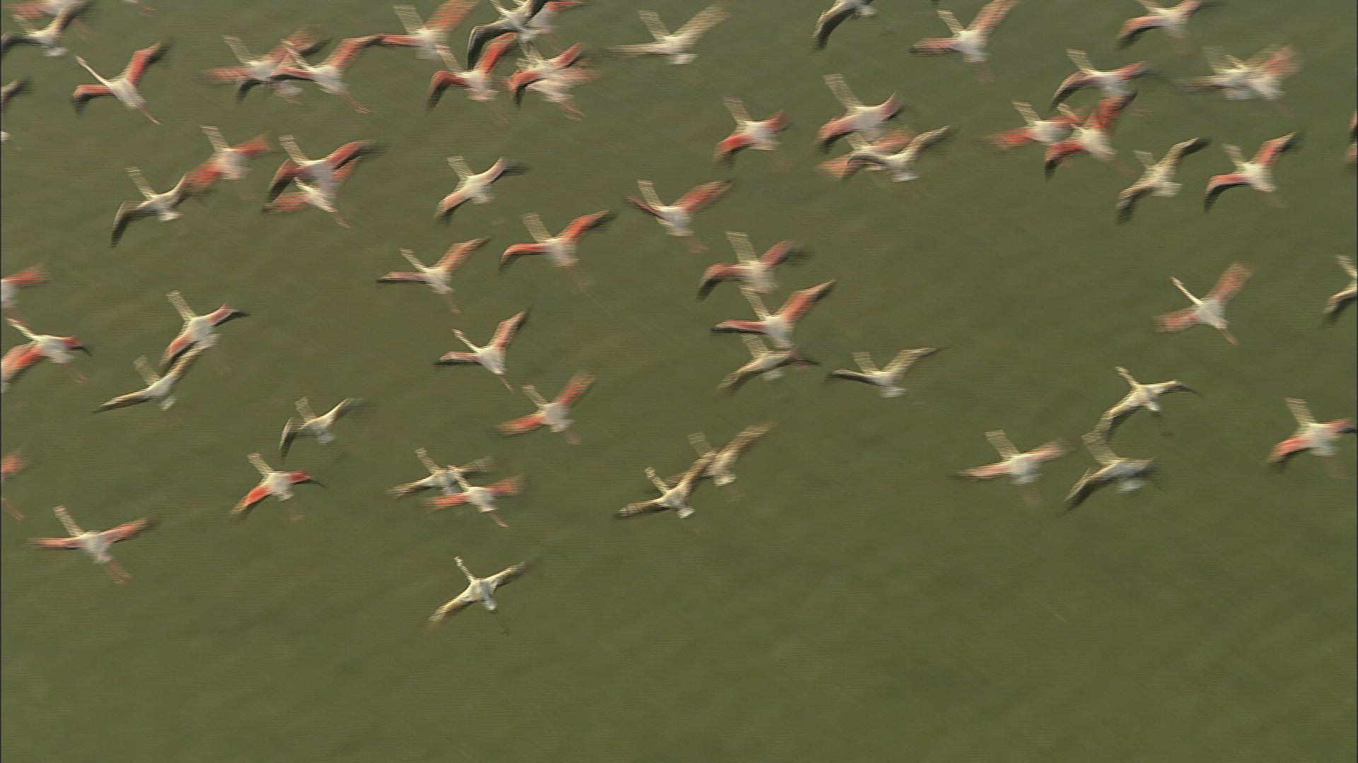 Two adult flamingos trying to feed the same chick with red crop milk