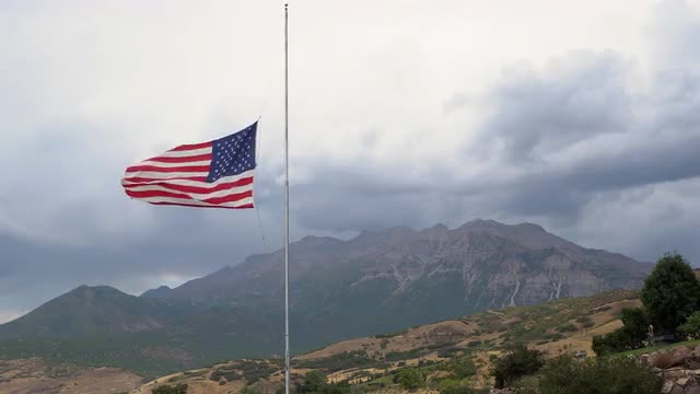American Flag at half-mast blowing in the wind for death of an officer in the line of duty.