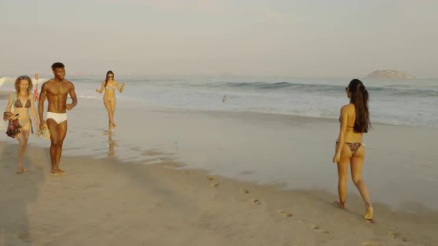 Slow motion static shot of young, attractive people walking along the surf at Ipanema beach in their swim suits. Filmed in Rio de Janeiro, Brazil.