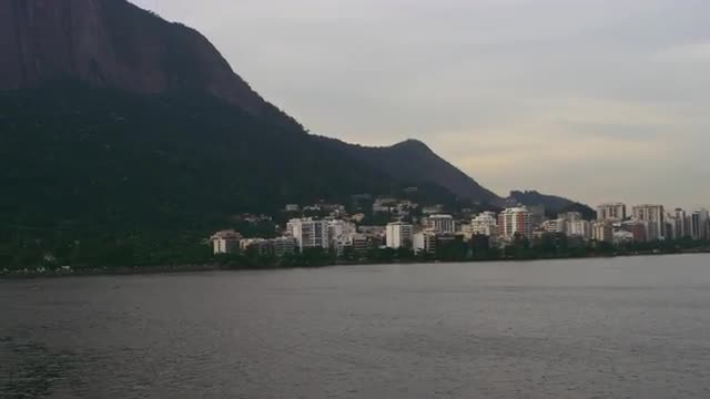 Aerial pan of lake and regional mountain geography - Rio de Janeiro, Brazil. Shot captures the details of water movement, the buildings on the shore of the lake, and geology.