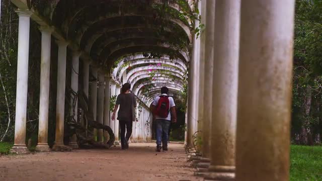 Panning shot of male and female walking under arches in Botanical gardens. Filmed during the day in Rio, Brazil on June 22, 2013.