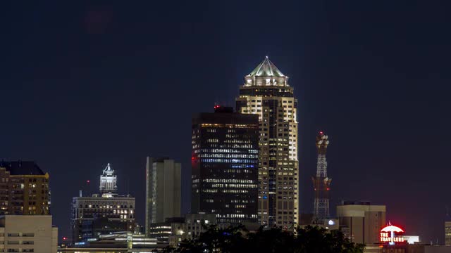 > Crescent moon setting over Des Moines skyline