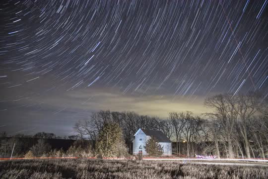 Star trails and light trails over rural church in Iowa