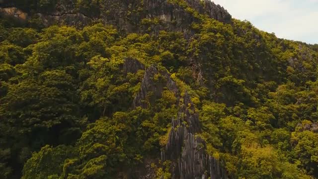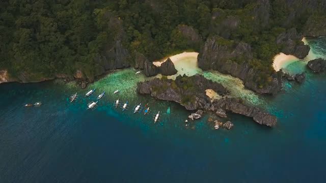 Aerial seascape tropical lagoon with azure water and coral reef among rocks with tropical vegetation, Palawan, Philippines Travel concept, Aerial footage.