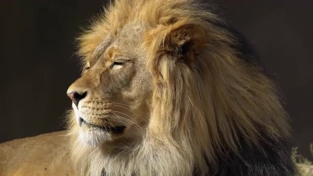 View of adult male lion as it tries to bite flies that are annoying him.