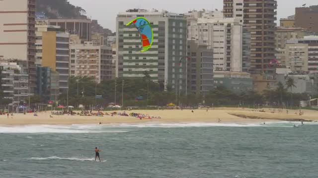 > Pan shot of parasailing surfer with Cityscaper in the background.